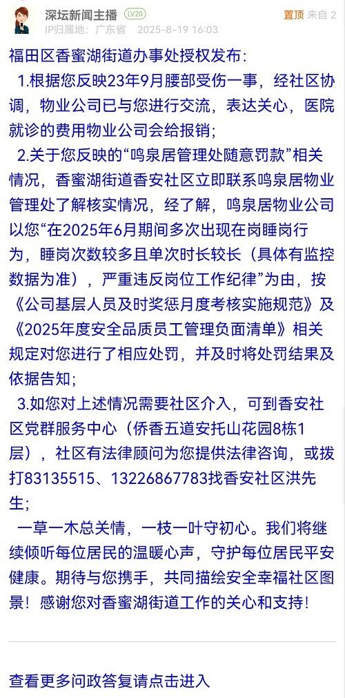 2.關于您反映的“鳴泉居管理處隨意罰款”相關情況,香蜜湖街道香安社區(qū)立即聯(lián)系鳴泉居物業(yè)管理處了解核實情況,經了解,鳴泉居物業(yè)公司以您“在2025年6月期間多次出現(xiàn)在崗睡崗行為,睡崗次數(shù)較多且單次時長較長(具體有監(jiān)控數(shù)據(jù)為準),嚴重違反崗位工作紀律”為由,按《公司基層人員及時獎懲月度考核實施規(guī)范》及《2025年度安全品質員工管理負面清單》相關規(guī)定對您進行了相應處罰,并及時將處罰結果及依據(jù)告知;