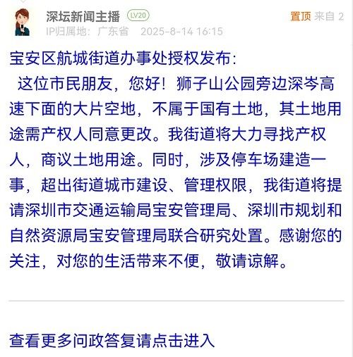 這位市民朋友,您好!獅子山公園旁邊深岑高速下面的大片空地,不屬于國有土地,其土地用途需產權人同意更改。我街道將大力尋找產權人,商議土地用途。同時,涉及停車場建造一事,超出街道城市建設、管理權限,我街道將提請深圳市交通運輸局寶安管理局、深圳市規(guī)劃和自然資源局寶安管理局聯(lián)合研究處置。感謝您的關注,對您的生活帶來不便,敬請諒解。