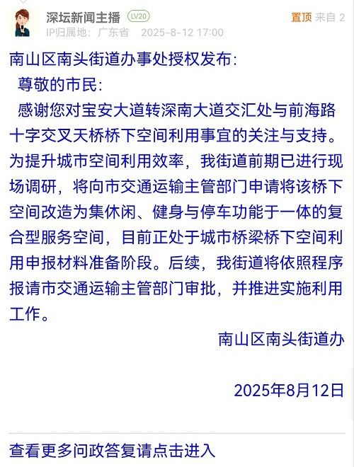 感謝您對寶安大道轉深南大道交匯處與前海路十字交叉天橋橋下空間利用事宜的關注與支持。為提升城市空間利用效率,我街道前期已進行現(xiàn)場調研,將向市交通運輸主管部門申請將該橋下空間改造為集休閑、健身與停車功能于一體的復合型服務空間,目前正處于城市橋梁橋下空間利用申報材料準備階段。后續(xù),我街道將依照程序報請市交通運輸主管部門審批,并推進實施利用工作。