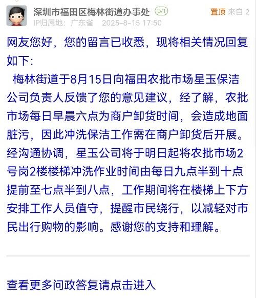 網友您好,您的留言已收悉,現(xiàn)將相關情況回復如下:梅林街道于8月15日向福田農批市場星玉保潔公司負責人反饋了您的意見建議,經了解,農批市場每日早晨六點為商戶卸貨時間,會造成地面臟污,因此沖洗保潔工作需在商戶卸貨后開展。經溝通協(xié)調,星玉公司將于明日起將農批市場2號崗2樓樓梯沖洗作業(yè)時間由每日九點半到十點提前至七點半到八點,工作期間將在樓梯上下方安排工作人員值守,提醒市民繞行,以減輕對市民出行購物的影響。感謝您的支持和理解。