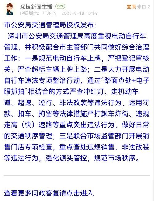深圳市公安局交通管理局高度重視電動自行車管理,并積極配合市主管部門共同做好綜合治理工作:一是規(guī)范電動自行車上牌,嚴把登記審核關,嚴查超標車輛上牌上路;二是大力開展電動自行車違法專項整治行動,通過“路面查處+電子眼抓拍”相結合的方式嚴查沖紅燈、走機動車道、超速、逆行、非法改裝等違法行為,運用罰款、扣車、拘留等法律措施嚴打飆車炸街、違規(guī)走高(快)速路等重點突出違法行為,做好日常的交通秩序管理;三是聯(lián)合市場監(jiān)管部門開展銷售門店專項檢查,重點查處違規(guī)銷售、非法改裝等違法行為,強化源頭管控,規(guī)范市場秩序。