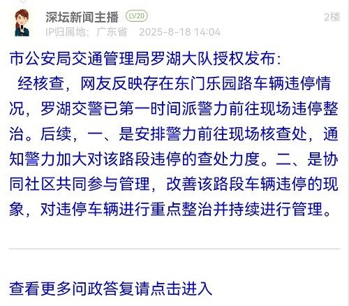 經核查,網友反映存在東門樂園路車輛違停情況,羅湖交警已第一時間派警力前往現(xiàn)場違停整治。后續(xù),一、是安排警力前往現(xiàn)場核查處,通知警力加大對該路段違停的查處力度。二、是協(xié)同社區(qū)共同參與管理,改善該路段車輛違停的現(xiàn)象,對違停車輛進行重點整治并持續(xù)進行管理。