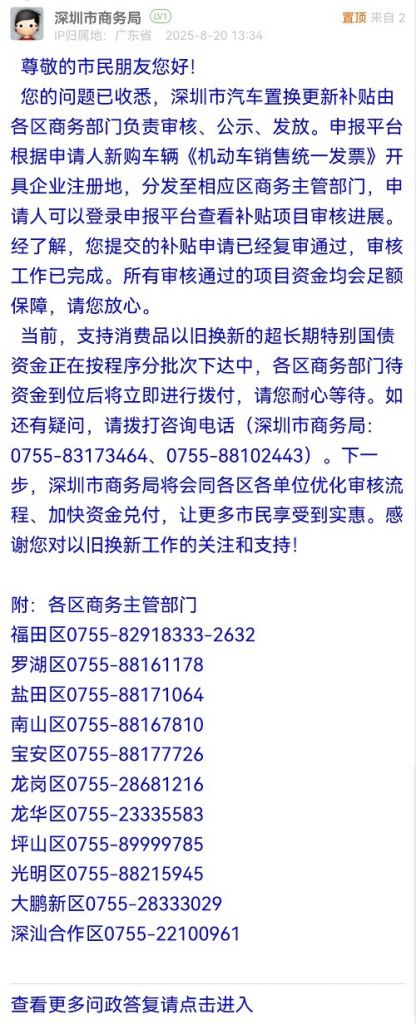 您的問題已收悉,深圳市汽車置換更新補貼由各區(qū)商務部門負責審核、公示、發(fā)放。申報平臺根據(jù)申請人新購車輛《機動車銷售統(tǒng)一發(fā)票》開具企業(yè)注冊地,分發(fā)至相應區(qū)商務主管部門,申請人可以登錄申報平臺查看補貼項目審核進展。經了解,您提交的補貼申請已經復審通過,審核工作已完成。所有審核通過的項目資金均會足額保障,請您放心。