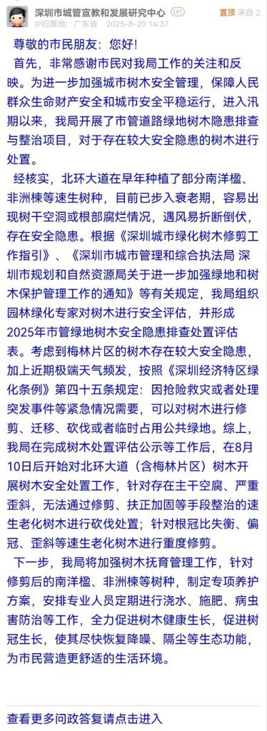 經核實,北環(huán)大道在早年種植了部分南洋楹、非洲楝等速生樹種,目前已步入衰老期,容易出現(xiàn)樹干空洞或根部腐爛情況,遇風易折斷倒伏,存在安全隱患。根據(jù)《深圳城市綠化樹木修剪工作指引》、《深圳市城市管理和綜合執(zhí)法局 深圳市規(guī)劃和自然資源局關于進一步加強綠地和樹木保護管理工作的通知》等有關規(guī)定,我局組織園林綠化專家對樹木進行安全評估,并形成2025年市管綠地樹木安全隱患排查處置評估表。考慮到梅林片區(qū)的樹木存在較大安全隱患,加上近期極端天氣頻發(fā),按照《深圳經濟特區(qū)綠化條例》第四十五條規(guī)定:因搶險救災或者處理突發(fā)事件等緊急情況需要,可以對樹木進行修剪、遷移、砍伐或者臨時占用公共綠地。綜上,我局在完成樹木處置評估公示等工作后,在8月10日后開始對北環(huán)大道(含梅林片區(qū))樹木開展樹木安全處置工作,針對存在主干空腐、嚴重歪斜,無法通過修剪、扶正加固等手段整治的速生老化樹木進行砍伐處置;針對根冠比失衡、偏冠、歪斜等速生老化樹木進行重度修剪。