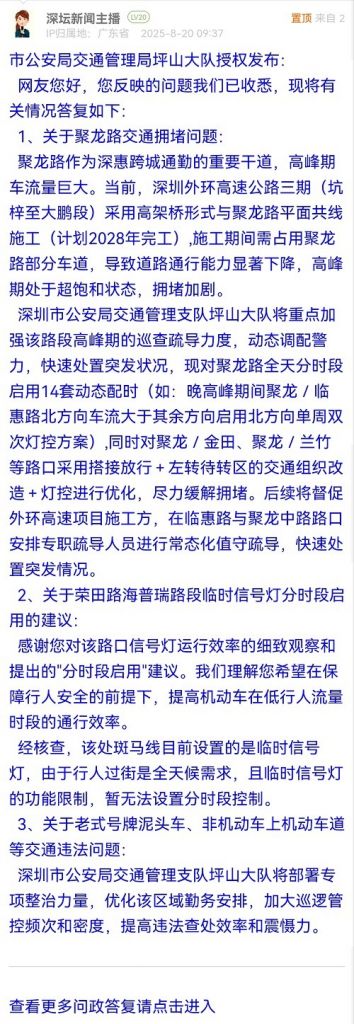 深圳市公安局交通管理支隊坪山大隊將重點加強該路段高峰期的巡查疏導力度,動態(tài)調配警力,快速處置突發(fā)狀況,現(xiàn)對聚龍路全天分時段啟用14套動態(tài)配時(如:晚高峰期間聚龍/臨惠路北方向車流大于其余方向啟用北方向單周雙次燈控方案),同時對聚龍/金田、聚龍/蘭竹等路口采用搭接放行+左轉待轉區(qū)的交通組織改造+燈控進行優(yōu)化,盡力緩解擁堵。后續(xù)將督促外環(huán)高速項目施工方,在臨惠路與聚龍中路路口安排專職疏導人員進行常態(tài)化值守疏導,快速處置突發(fā)情況。