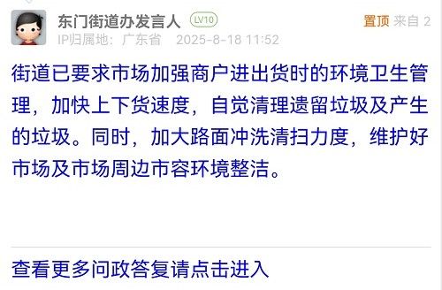 街道已要求市場加強商戶進出貨時的環(huán)境衛(wèi)生管理,加快上下貨速度,自覺清理遺留垃圾及產生的垃圾。同時,加大路面沖洗清掃力度,維護好市場及市場周邊市容環(huán)境整潔。