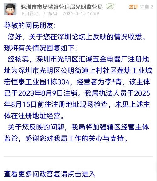 尊敬的網民朋友:您好,關于您在深圳論壇上反映的情況收悉?,F(xiàn)將有關情況回復如下:經核實,深圳市光明區(qū)匯誠五金電器廠注冊地址為深圳市光明區(qū)公明街道上村社區(qū)蓮塘工業(yè)城宏恒泰工業(yè)園1棟304,經營者為李*青,該主體已于2023年8月9日注銷。我局執(zhí)法人員于2025年8月15日前往注冊地址現(xiàn)場檢查,未見上述主體在注冊地址經營。關于您反映的問題,我局將加強轄區(qū)經營主體監(jiān)管,感謝您對我局工作的關心與支持。