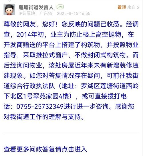 尊敬的網友,您好!您反映的問題已收悉。經調查,2014年初,業(yè)主為防止樓上高空拋物,在開發(fā)商贈送的平臺上搭建了構筑物,并按照物業(yè)指導,采取推拉式窗戶,不做封閉式構筑物。而后經詢問物業(yè),該處房屋近年來未有新增裝修違建現(xiàn)象。如您對答復情況存在疑問,可前往我街道綜合行政執(zhí)法隊(地址:羅湖區(qū)蓮塘街道西嶺下北區(qū)1號翠苑家園4樓),或可直接撥打電話:0755-25732349進行進一步咨詢。感謝您對我街道工作的理解與支持。
