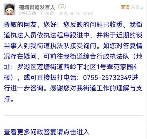 尊敬的網友,您好!您反映的問題已收悉。我街道執(zhí)法人員依執(zhí)法程序跟進中,并將于近期約談當事人到我街道執(zhí)法隊接受詢問。如您對答復情況存在疑問,可前往我街道綜合行政執(zhí)法隊(地址:羅湖區(qū)蓮塘街道西嶺下北區(qū)1號翠苑家園4樓),或可直接撥打電話:0755-25732349進行進一步咨詢。感謝您對我街道工作的理解與支持。