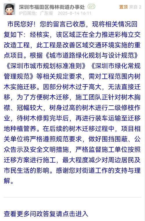 市民您好!您的留言已收悉,現(xiàn)將相關情況回復如下:經核實,該區(qū)域正在全力推進彩梅立交改造工程,此工程是改善區(qū)域交通環(huán)境實施的重點項目。根據(jù)《城市道路綠化規(guī)劃與設計規(guī)范》《深圳市城市規(guī)劃標準準則》《深圳市綠化常規(guī)管理規(guī)范》等相關規(guī)定要求,需對工程范圍內樹木實施遷移。因部分樹木過于高大,無法直接遷移,為了方便樹木遷移,施工團隊正針對樹木胸襟、冠幅較大,樹身過高的樹木進行二級修枝作業(yè),待樹木修剪完畢后,再進行裝車運輸至遷移地種植管養(yǎng)。在后續(xù)的樹木遷移過程中,項目相關單位將嚴格遵照規(guī)范要求,做好圍擋圍蔽、公眾告示及安全文明措施,嚴格監(jiān)督施工單位按照遷移方案進行施工,最大程度減少對周邊居民及市民生活的影響。感謝您對街道工作的支持與理解。
