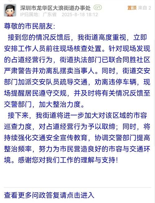 接下來,我街道將進一步加大對該區(qū)域的市容巡查力度,對占道經營行為予以取締;同時,將持續(xù)強化交通安全宣傳教育,協(xié)調交警部門提高整治頻率,努力為市民營造良好的市容與交通環(huán)境。感謝您對我們工作的理解與支持!