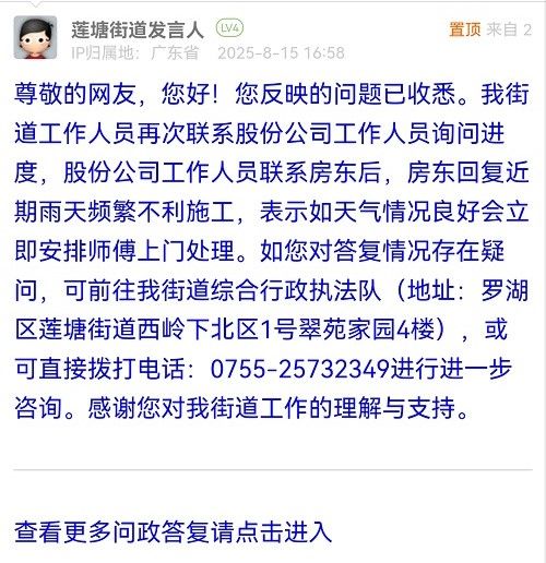 尊敬的網友,您好!您反映的問題已收悉。我街道工作人員再次聯(lián)系股份公司工作人員詢問進度,股份公司工作人員聯(lián)系房東后,房東回復近期雨天頻繁不利施工,表示如天氣情況良好會立即安排師傅上門處理。如您對答復情況存在疑問,可前往我街道綜合行政執(zhí)法隊(地址:羅湖區(qū)蓮塘街道西嶺下北區(qū)1號翠苑家園4樓),或可直接撥打電話:0755-25732349進行進一步咨詢。感謝您對我街道工作的理解與支持。